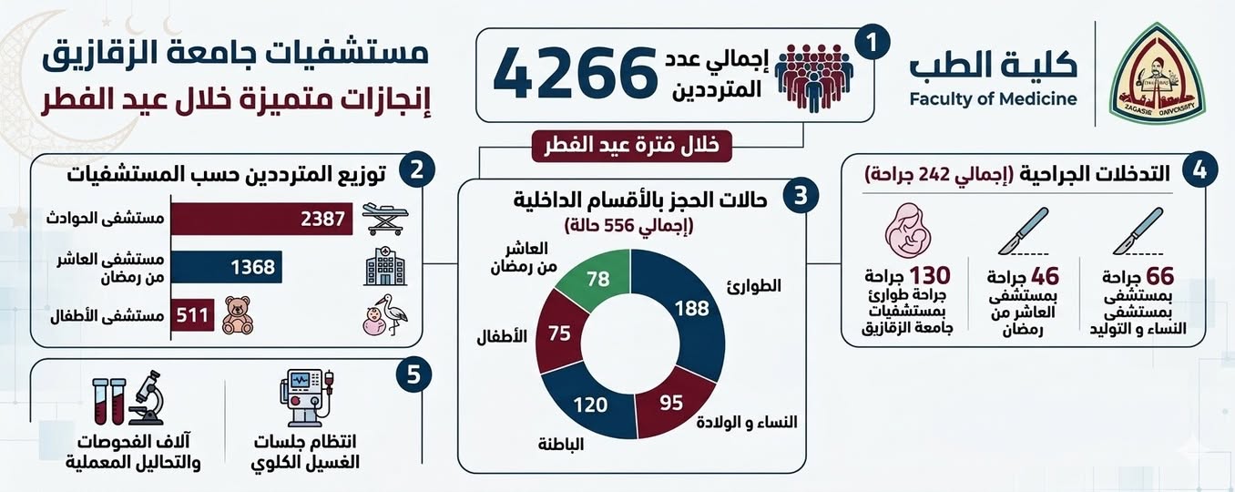 مستشفيات جامعة الزقازيق تستقبل 4266 حالة طوارئ وتجري 242 جراحة خلال عيد الفطر2026