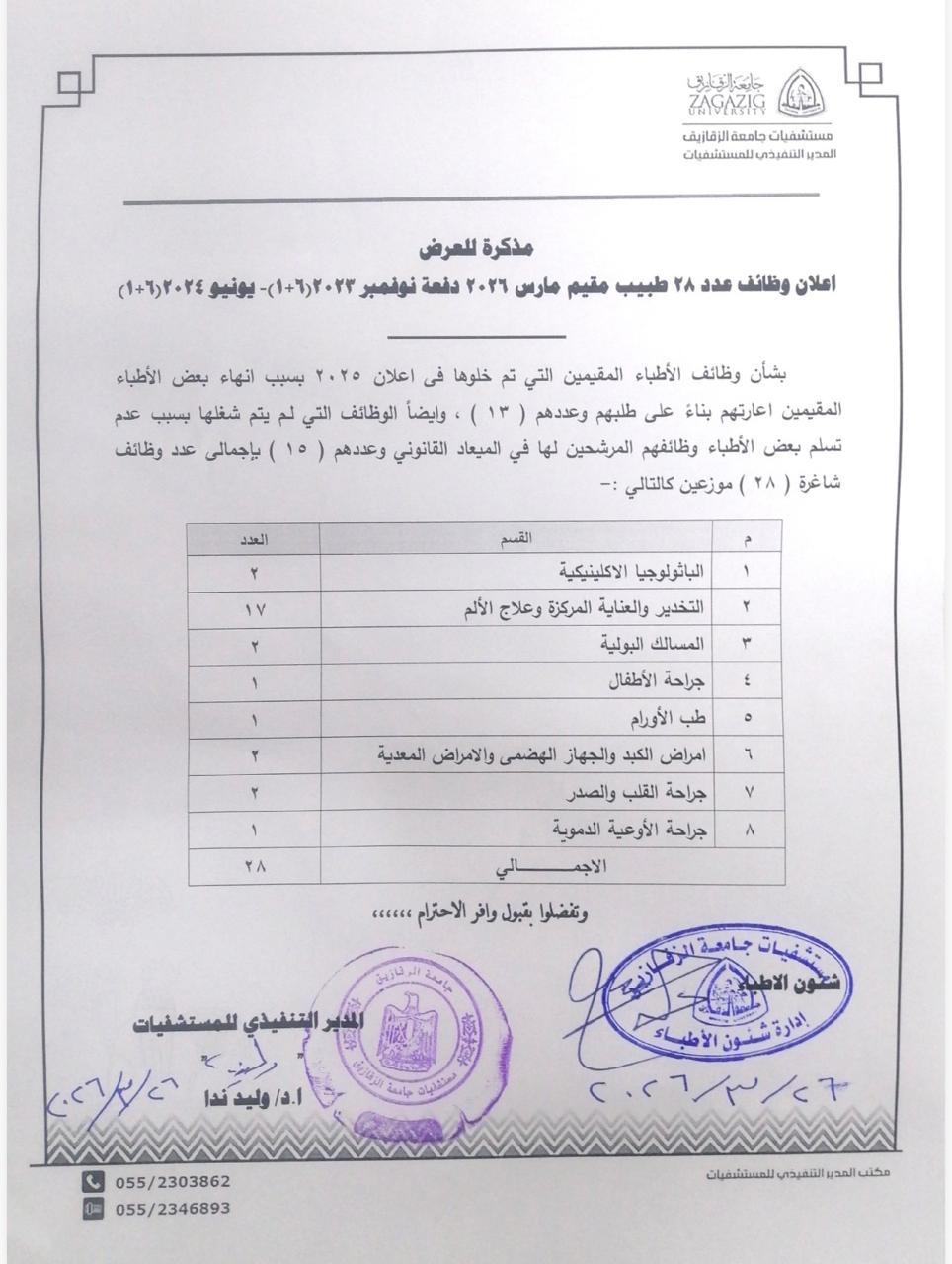 إعلان وظائف عدد 28 طبيب مقيم: مارس 2026