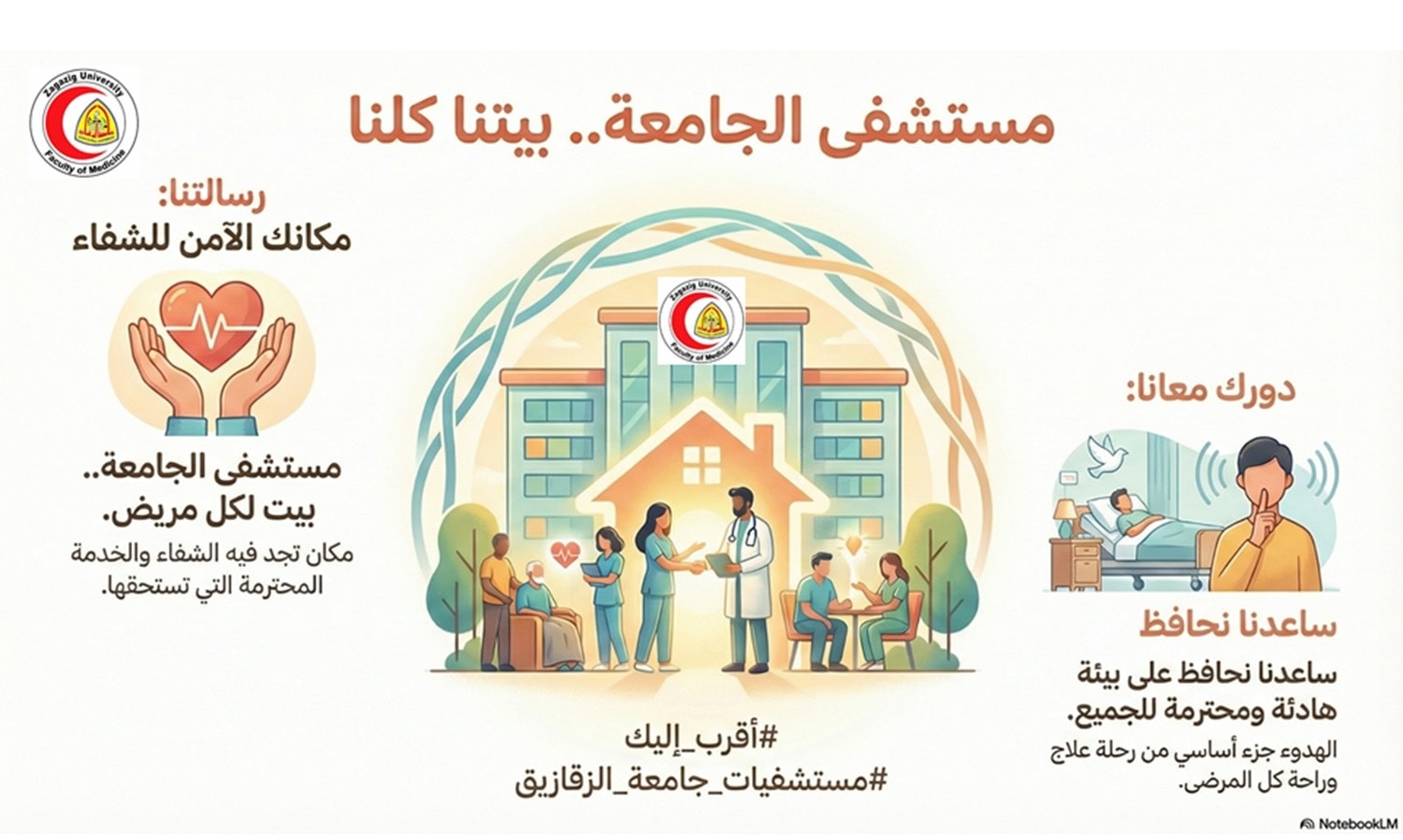 #مستشفى_الجامعة_بيت_كل_مريض - مستشفيات جامعة الزقازيق هي بيت لكل مريض يبحث عن شفاء وخدمة محترمة. - ساعدنا نحافظ على بيئة هادئة ومحترمة للجميع