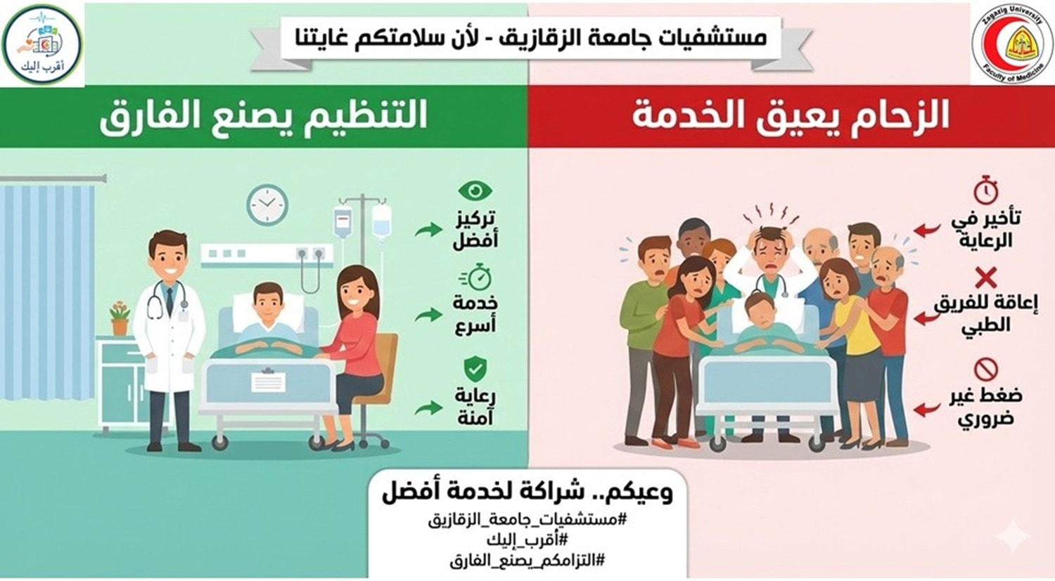 - لأن سلامتكم هي غايتنا، نرجو من رواد مستشفيات جامعة الزقازيق الالتزام بمرافق واحد فقط لكل مريض داخل قسم الاستقبال، لضمان جودة وسرعة الخدمة الطبية:
