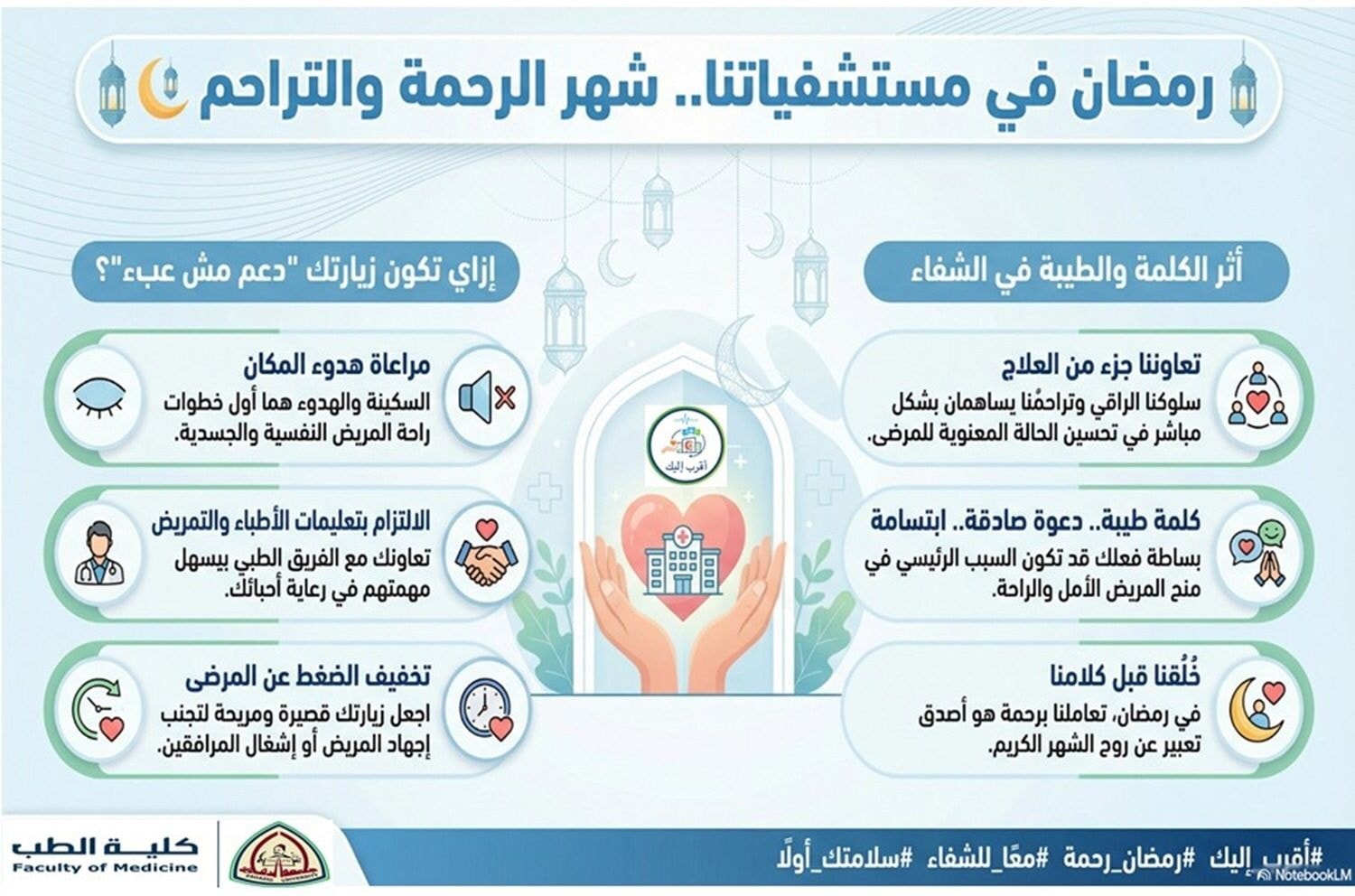 رمضان في مستشفياتنا .. شهر الرحمة والتراحم في هذا الشهر المبارك، دعاؤنا لكم بالصحة والقوة. صبركم وأملكم عبادة، وعطاؤكم نورٌ يخفف الألم ويزرع الطمأنينة. رمضانكم شفاء وأجر. مستشفيات جامعة الزقازيق ... أقرب إليك دائمًا.