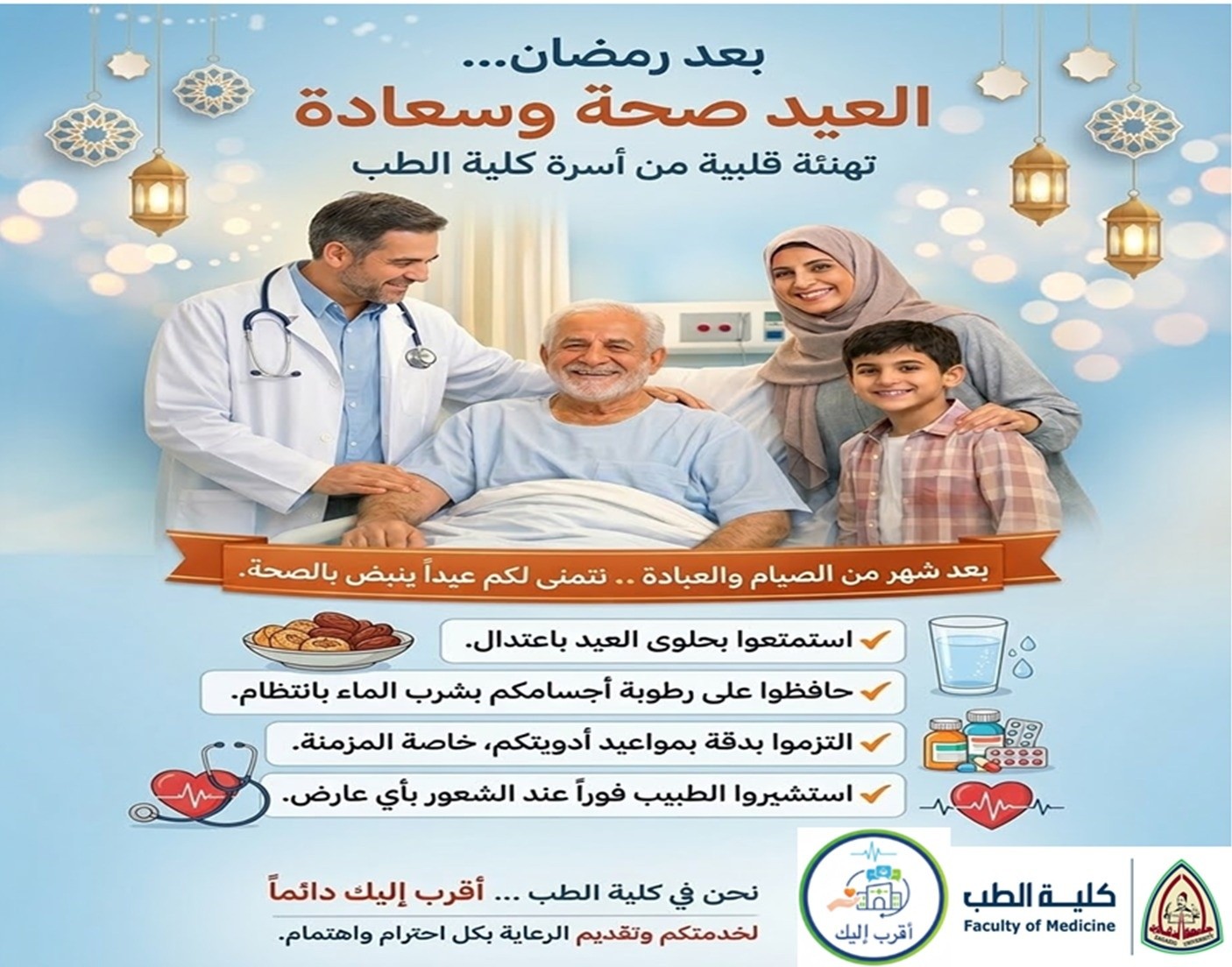 بحلول عيد الفطر المبارك، تتقدم إدارة الكلية بأصدق التهاني لجميع المرضى والمرافقين والزائرين. ضمن حملة "أقرب إليك" نحرص على الاستماع لآرائكم وملاحظاتكم. شاركونا مقترحاتكم لتطوير الخدمات وتحسين تجربة المرضى داخل مستشفيات جامعة الزقازيق .