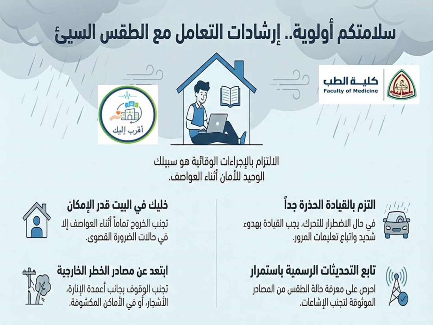 في إطار حرص إدارة المستشفيات على سلامة جميع منسوبيها، وتماشياً مع تقارير الهيئة العامة للأرصاد الجوية نظراً لسوء الأحوال الجوية المتوقعة؛ نهيب بسيادتكم الالتزام بالإجراءات الوقائية التالية:
